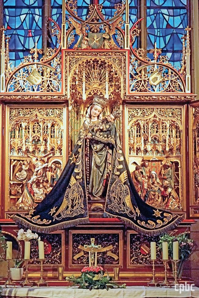| ‘바다의 별’ 성모상(15세기). 원래 마스트리흐트 프란치스코회 성당에 모셔져 있었다. 전쟁과 세속화 속에 여러 차례 옮기다가 1837년 성 니콜라스 성당 폐쇄 후 지금의 성모 바실리카로 옮겼고, 1903년 바실리카 입구의 메로데 소성당에 자리 잡았다. 1912년 성 비오 10세 교황의 대관으로 ‘바다의 별’ 성모상으로 공식 선포되었다 |