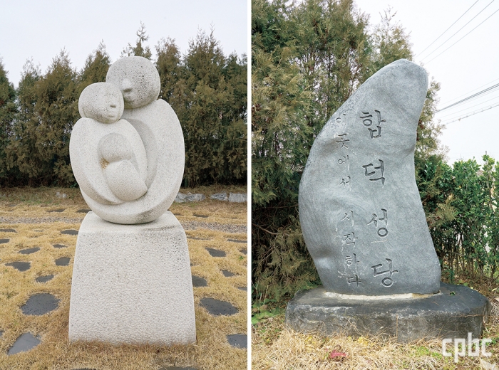 | 성가정상과 표지석. 성가정상은 합덕본당의 수호자인 나자렛 성가정을 상징한다 |