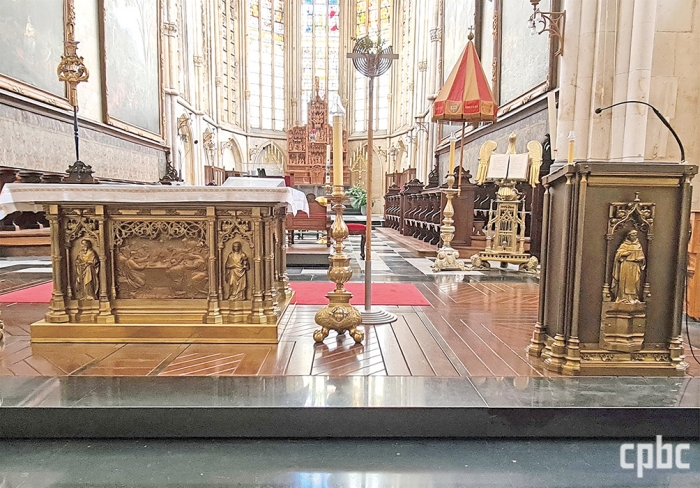 시선은 주 제대로 향합니다. 주 제대 위에는 성모 마리아의 일생이 드라마처럼 펼쳐진 목판 조각 제대화가 있고, 제대 양옆으로 독수리 모양의 황동 독서대와 3m 높이의 부활 촛대가 세워져 있습니다. 주 제대 뒤 창에는 성모 마리아의 삶과 그리스도의 부활, 교회 교부를 주제로 한 스테인드글라스가 보입니다.