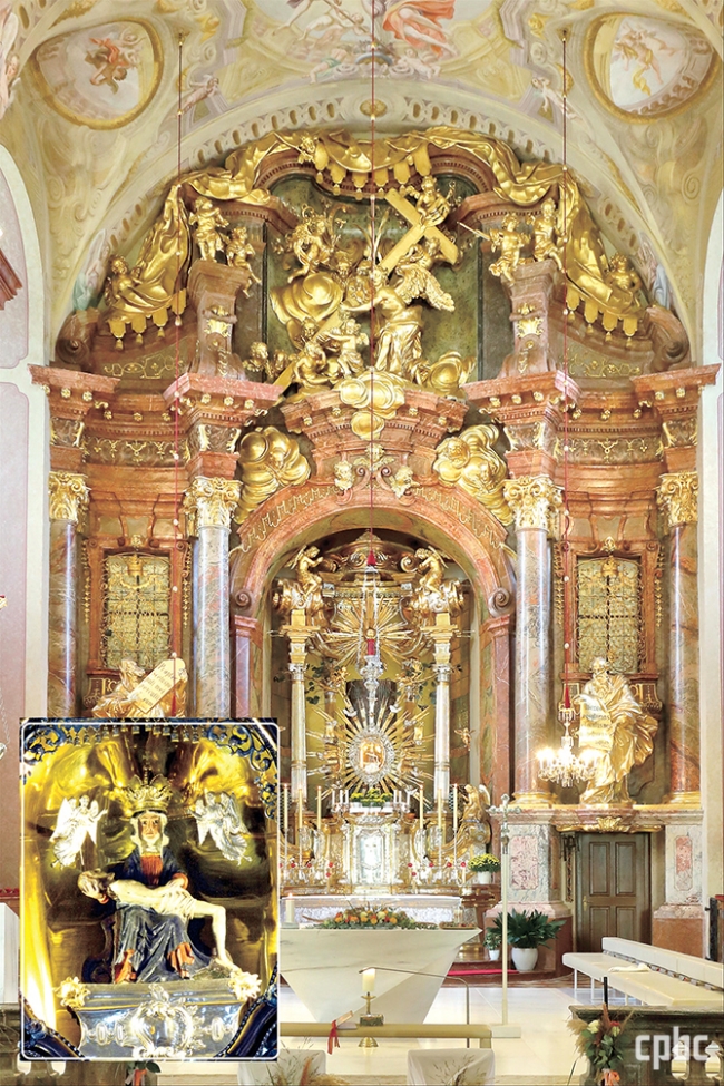 | 마리아 타펄 바실리카의 주 제대와 은총의 피에타상. 성모 신심의 중심이 된 은총의 피에타를 모신 참나무 자리에 주 제대를 조성했다. 성당의 주 제대가 동쪽이 아니라 북쪽에 자리한 것도 이 때문일 수 있다. 1734년 파사우 출신의 조각가 요제프 마티아스 괴츠가 설계했으며, 린츠의 건축가 요한 미하엘 프룬너와 금세공인 요한 페터 슈벤터의 참여로 1739년에 완성되었다 |