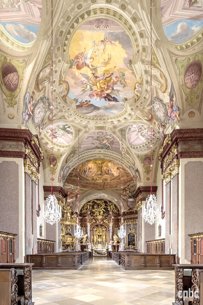 | 단일 신랑의 짧은 교차랑 구조인 마리아 타펄 바실리카. 1713~1718년 기존의 석고 장식을 걷어 내고, 안토니오 베두치의 밑그림대로 벽면과 천장을 하나의 천상 무대로 구현했다. 교차랑 위의 돔 천장에는 성모 승천과 성모의 삶, 신랑의 천장에는 성 요셉의 영광이 묘사되어 있다 |